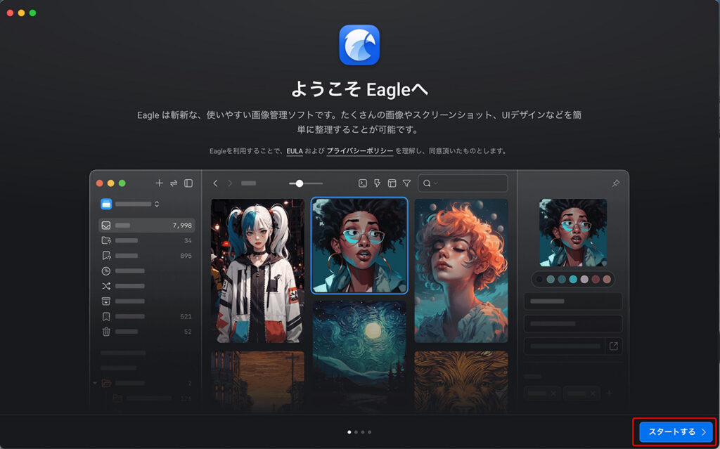 「ようこそEagleへ」の画面が立ち上がるので、右下部の「スタートする」をクリックします。