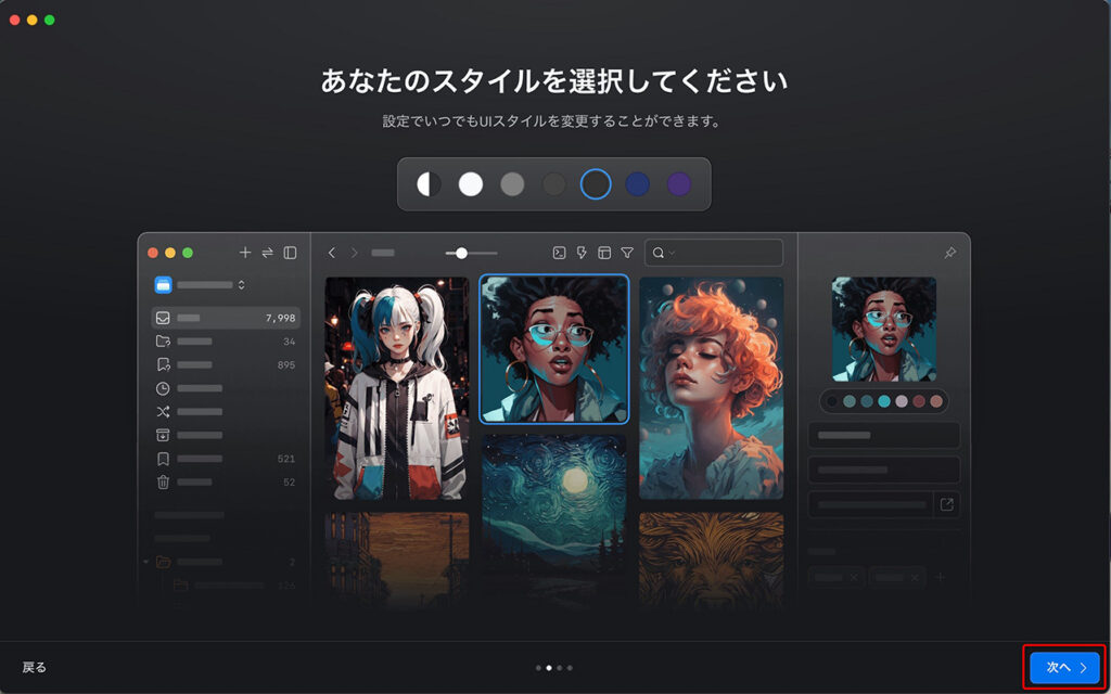 自分の好みのUIスタイル(アプリの背景色)を選択し、「次へ」をクリックします。